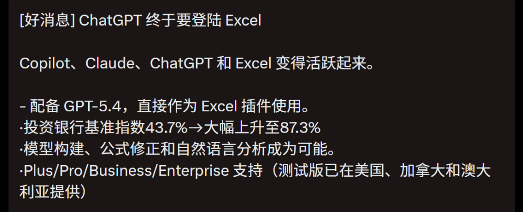 而且,搭载GPT-5.4的ChatGPT插件,已经可以直接在Excel中使用了!