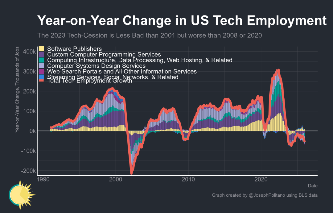 从1990年到2026年的美国科技就业年同比变化图上,当前的下坠曲线从2023年开始一路走低,规模和持续时间上,只有一个时期能与之相比——2001年互联网泡沫破裂。
