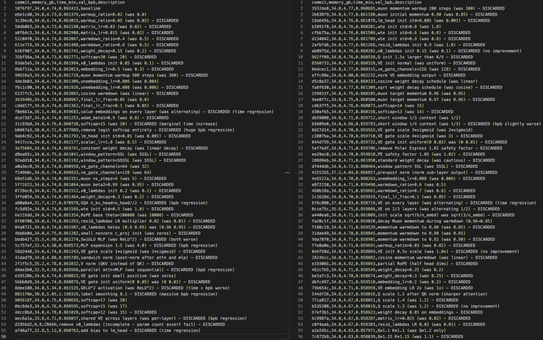 他给AI代理写了一份大约120行的Markdown文档,相当于一份「任务说明书」,告诉AI:这个项目是干什么的,什么样的改进算好的(验证损失更低),什么样的改进不能接受(训练时间变长、内存爆炸、代码变得太臃肿)。