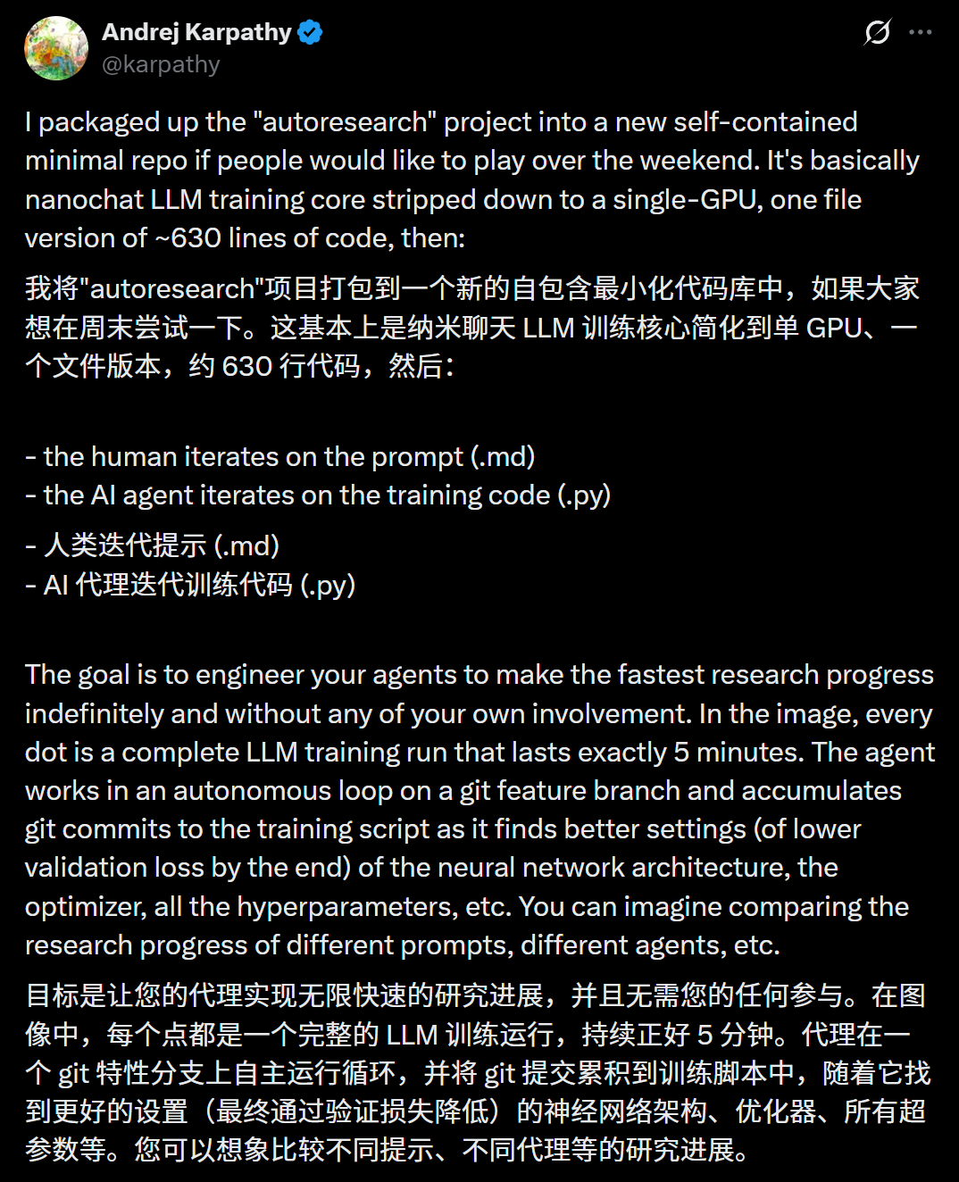 Karpathy正式开源了autoresearch项目。