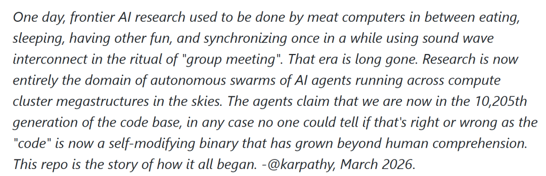Karpathy为autoresearch写的那段序言里有一句话特别值得玩味——这个代码仓库,正是这一切故事的起点。