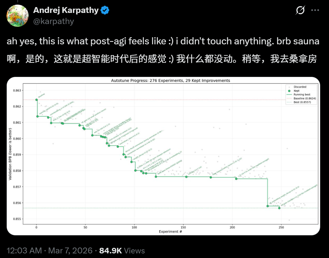 而autoresearch的开源,让这件事的门槛降到了令人瞠目的程度。