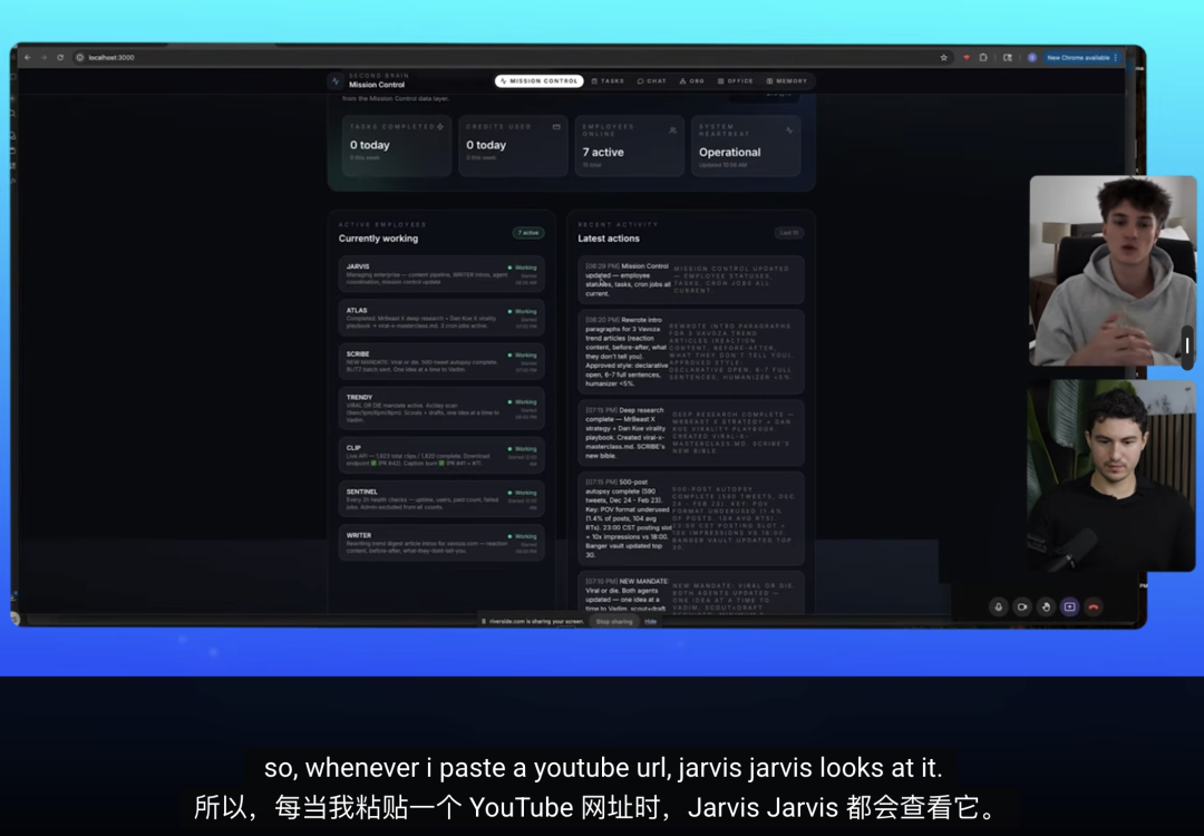 比如,检测到YouTube URL,直接转给视频剪辑AI;出了深度研究报告,第一时间分配给内容创作AI……在贾维斯的统筹下,各个部门的龙虾员工按部就班,各展所长。