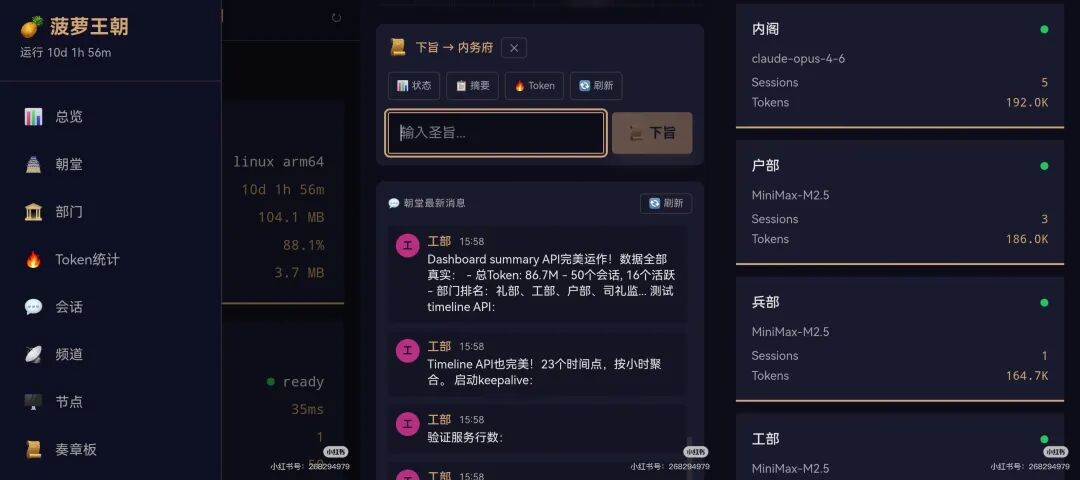 设计、开发、研究、内容、运营部门一个不落,每只龙虾各司其职,主打一个专业高效。