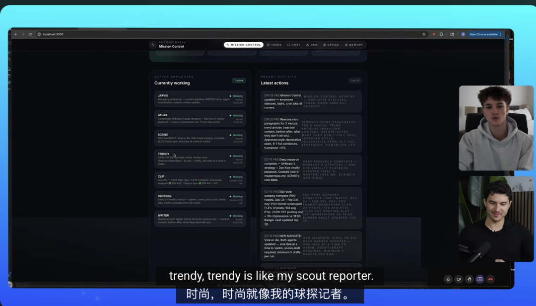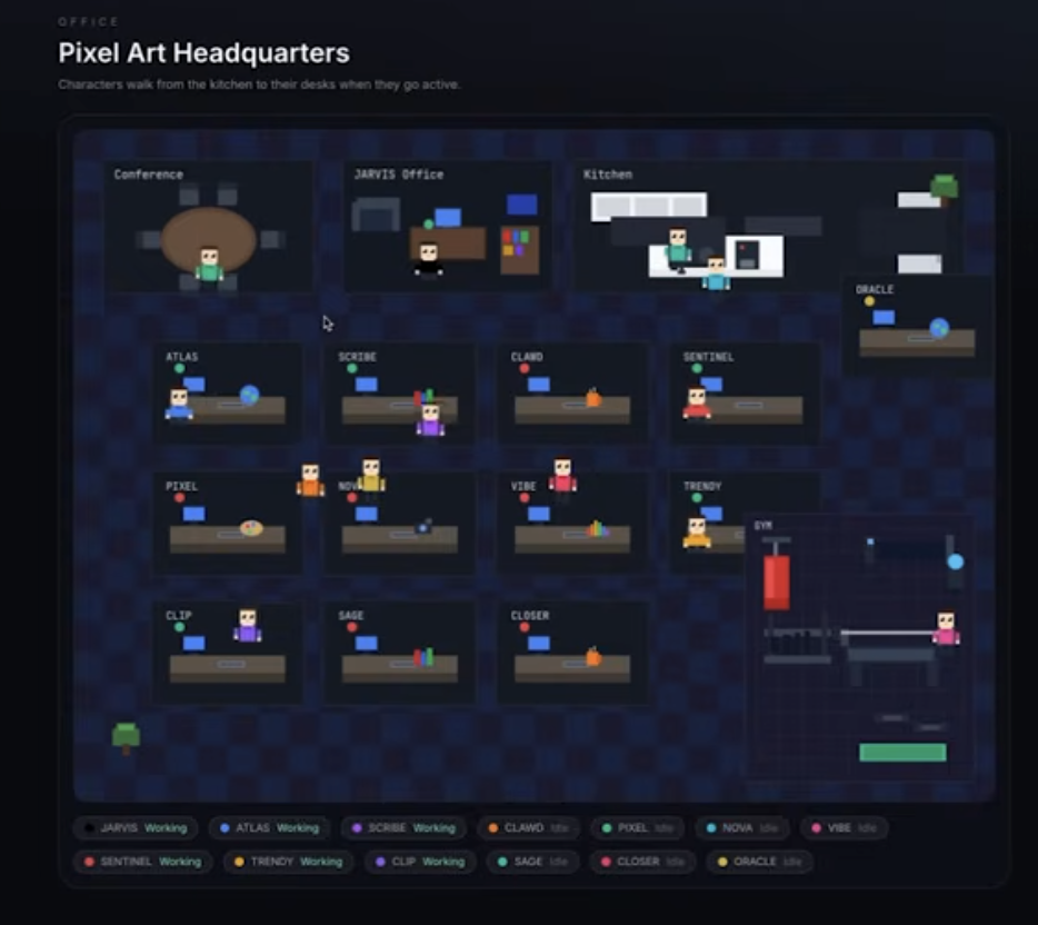 他还自建了一个可视化任务控制中心,就像一个AI办公室一样,让整个AI团队的工作流程一目了然。