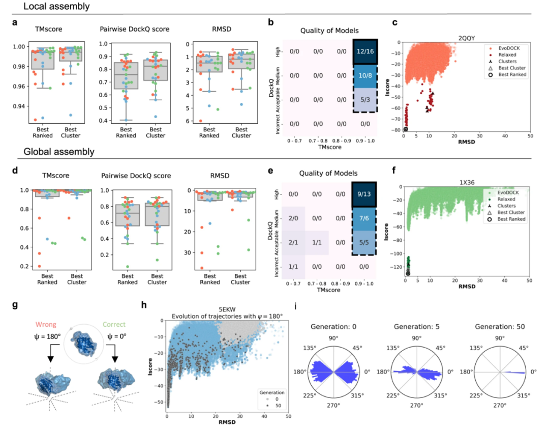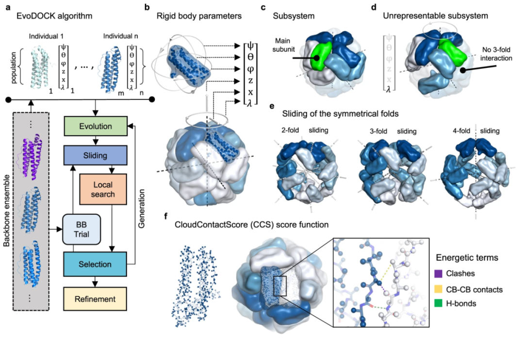 (3)全局优化:研究团队进一步基于其先前开发的EvoDOCK算法(原用于异源二聚体对接),针对对称组装系统进行了四项关键升级,形成“对称EvoDOCK”流程(如图2所示)。该流程采用差分进化与蒙特卡洛相结合的混合优化方法:首先初始化种群,每个个体包含随机选取的亚基构象及六个对称参数;随后在进化阶段通过突变和重组推动全局搜索;并辅以Rosetta全原子能量函数(REF2015)进行局部精细优化。为有效避免空间冲突,团队设计了“滑动移动”策略,使亚基沿对称轴以0.3Å为步长逐步移动,最多尝试100步,并优先处理高阶对称轴(如二十面体的5轴)。同时,开发了CloudContactScore(CCS)快速碰撞检测函数,通过点云简化(仅保留骨架原子N、C、O、CA、CB)并综合四项评分(碰撞惩罚、氢键奖励、疏水接触等),将检测效率提升了10倍。最终,对筛选出的Top 100模型进行Rosetta全原子松弛和k-means聚类,每类选取能量最低的代表模型作为最终预测结果。