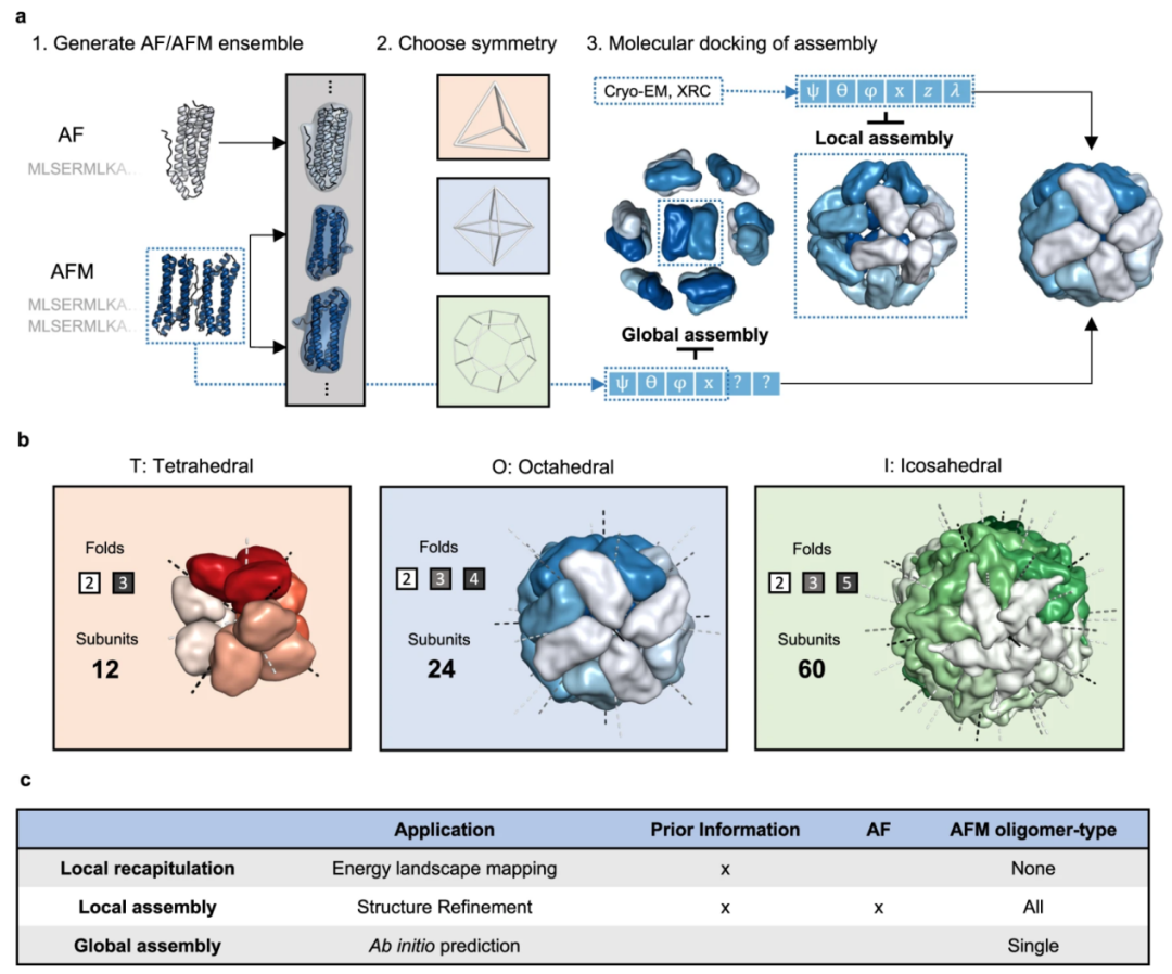 (2)对称约束:在对称框架构建与参数降维方面,研究团队利用立方对称性(如图1b的T、O、I三类)将系统的自由度从数百万大幅压缩至六个关键参数:三个旋转参数(ψ、θ、φ分别对应绕x、y、z轴的旋转)和三个平移参数(z表示组装体半径,x为寡聚体到原点的距离,λ为整体旋转角)。为避免结构崩溃,团队引入数学约束机制,例如将λ的旋转范围限制为360°/n(n为对称轴阶数,如二十面体的5轴对应λ∈[-72°,72°])。此外,根据是否已知模板信息,采用双模式采样策略:在局部组装中,参数在实验值附近小范围扰动;而在全局组装中,部分参数(如z)从AFM预测的寡聚体中提取,其余参数则在宽范围内随机采样,以覆盖更广的构象空间。