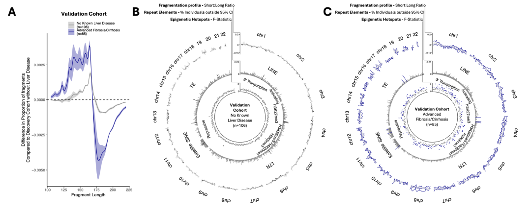 图2.验证队列中肝纤维化和肝硬化患者的cfDNA片段组的变化。