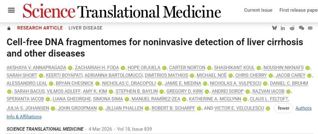 AKSHAYA V. ANNAPRAGADA, ZACHARIAH H. FODA , HOPE ORJUELA, et al. Cell-free DNA fragmentomes for noninvasive detection of liver cirrhosis and other diseases. SCIENCE TRANSLATIONAL MEDICINE, 4 Mar 2026.