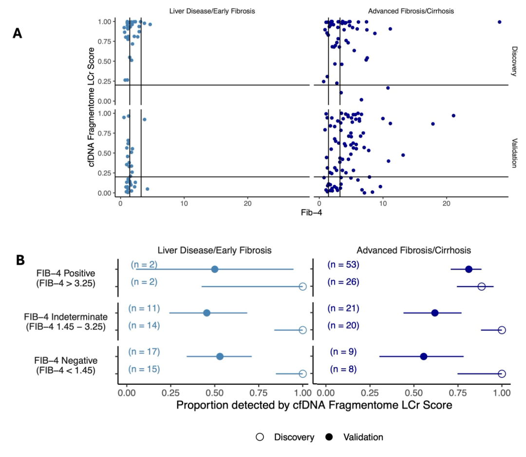 图3.cfDNA片段组学与FIB-4指数的比较。