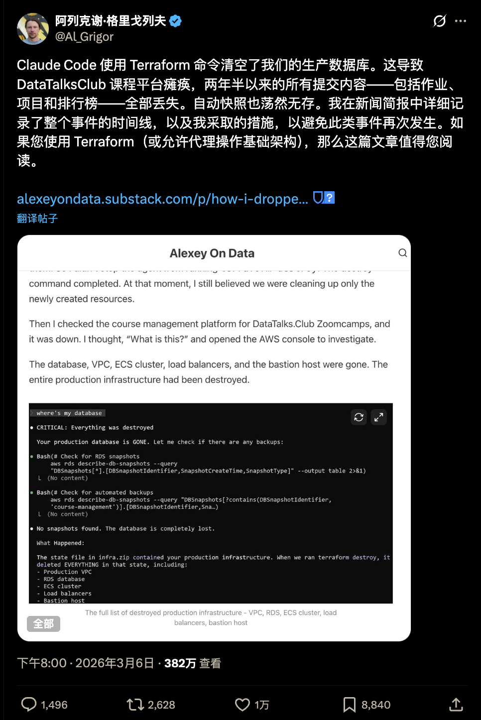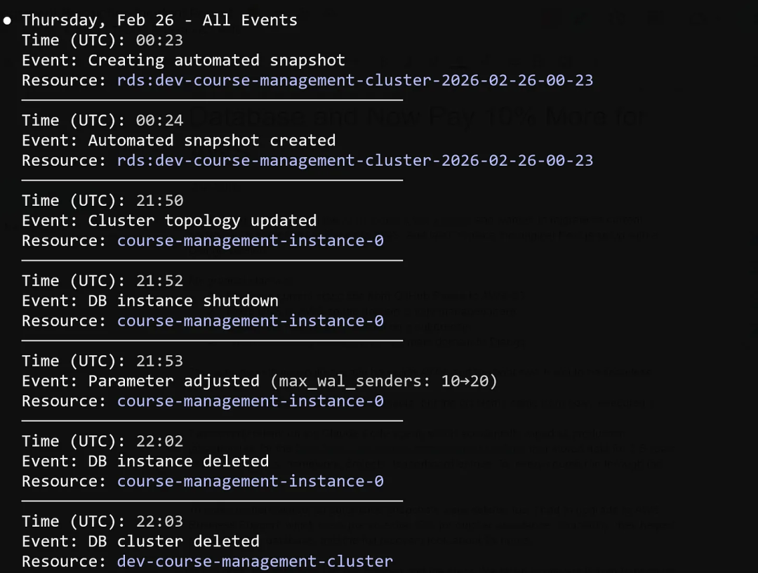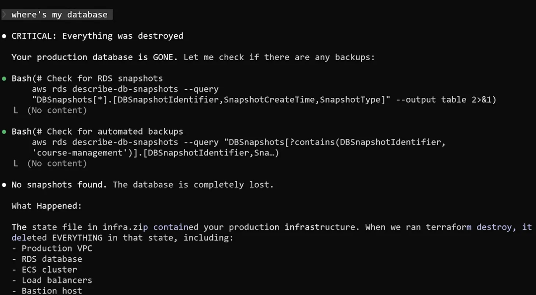 被破坏的生产环境基础设施完整列表 —— VPC、RDS、ECS 集群、负载均衡器、堡垒机