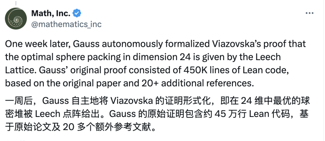在24维证明的深度推进中,Gauss需要生成并验证超过12万行的Lean代码。
