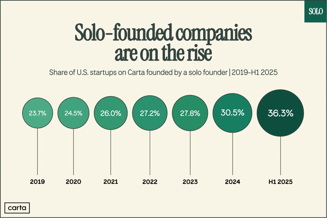 Carta的量化数据表明:如今36.3%的新公司,都是solo founder创立的。