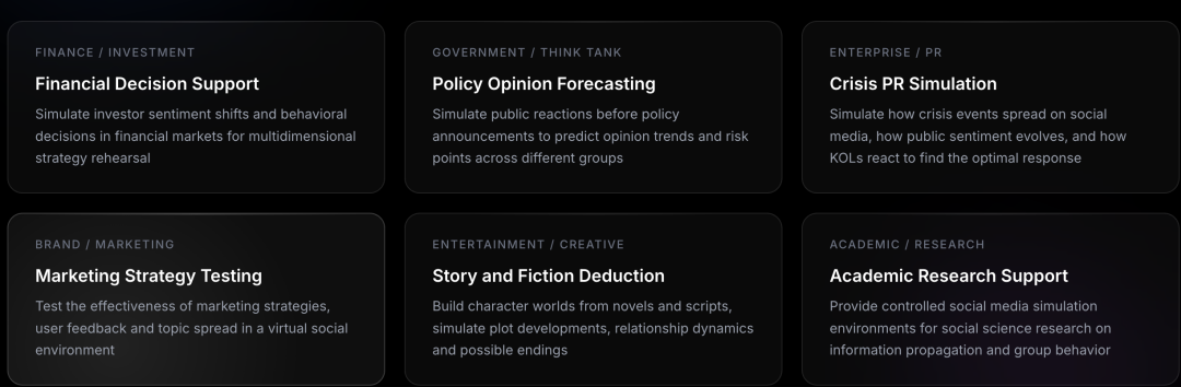 MiroFish的目标应用场景:金融决策支持、政策舆论预测、公关危机模拟、营销策略测试、故事与虚构推演、学术研究支持