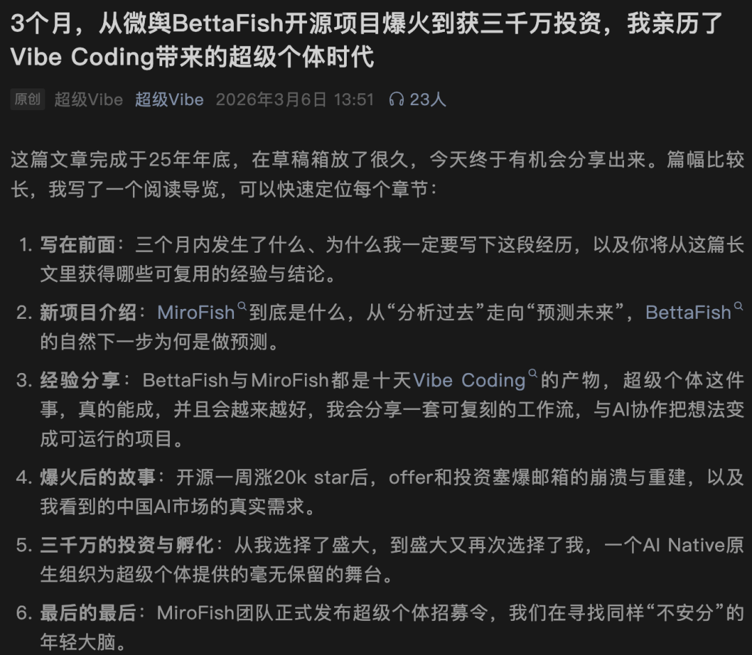 让人没想到的是,超越OpenAI、谷歌、微软等机构的开源项目的MiroFish,背后是一个国内大四学生,仅仅3个月的时间,就拿下3000万投资。