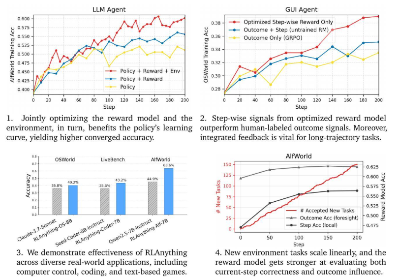 我们提出RLAnything,一种让环境,策略和奖励模型互相反馈,同时提升的强化学习框架,从而增强训练的信号强度并优化整个系统。具体来说,策略模型同时接收来自环境的最终验证结果与来自奖励模型的逐步奖励,并将二者融合为统一的综合型反馈(integrated feedback);奖励模型结合最终结果反馈与自洽性约束,构造一致性反馈(consistency feedback),与策略模型进行联合优化,从而进一步提升策略模型的训练效果;我们从理论上证明,对环境任务难度进行调控不仅有利于策略模型优化,也能促进奖励模型的学习;因此,我们基于策略模型与奖励模型的批判反馈(critic feedback),自适应地调控环境任务难度,从而形成闭环优化。