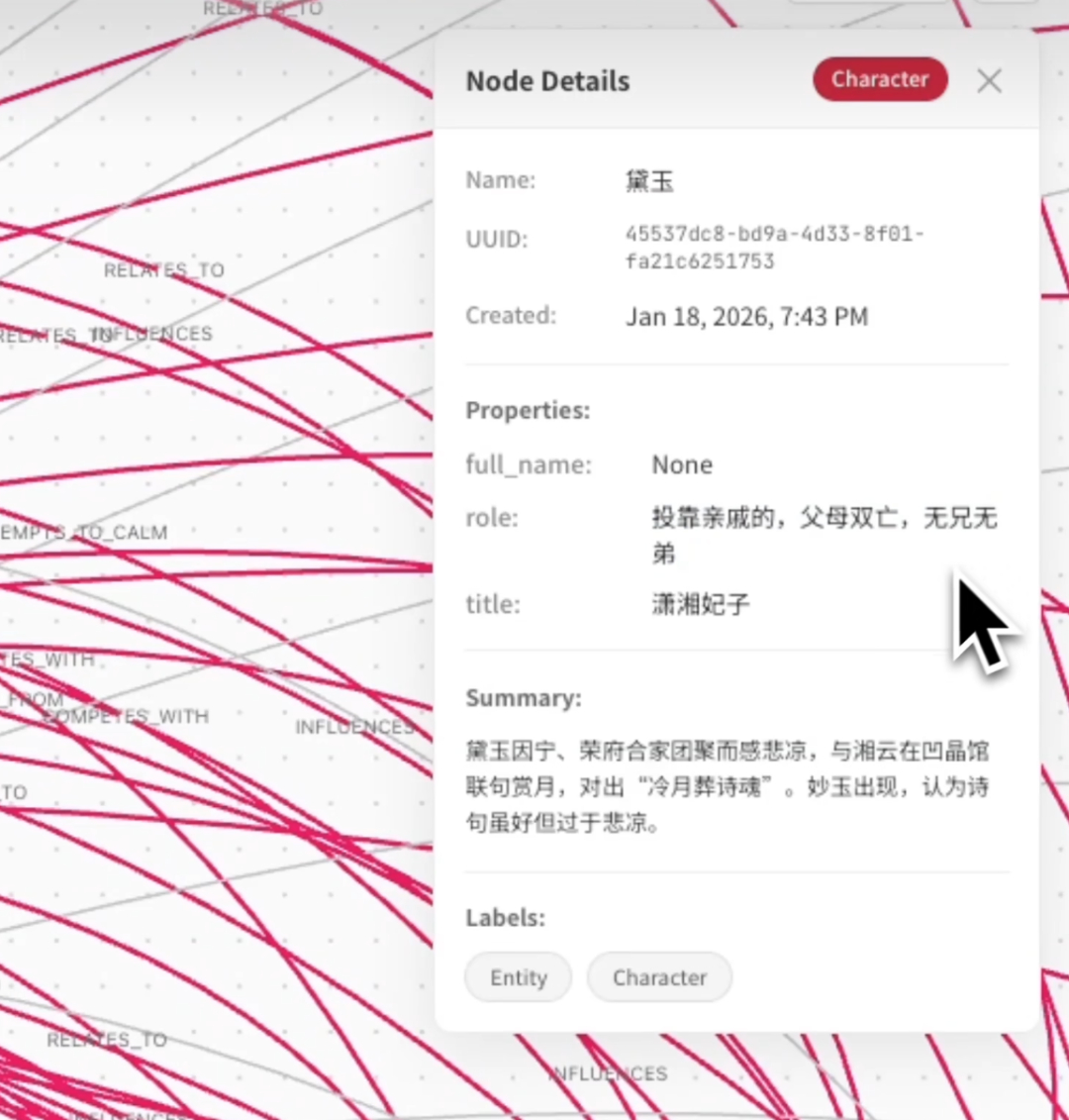 点开每个节点也可以看到角色的详细介绍,以及角色在故事中发生的最新事件的总结。如黛玉的最新事件就是第76回的“冷月葬诗魂”。