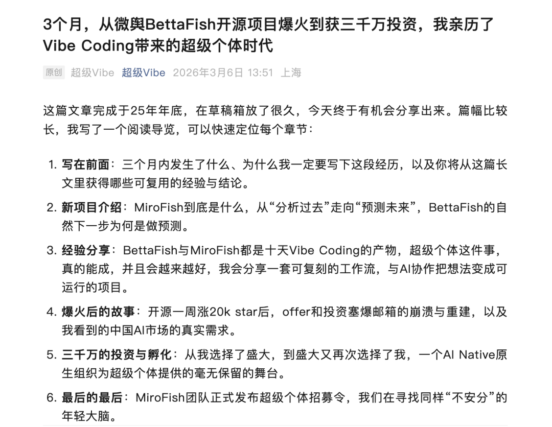 在文章中,BaiFu非常兴奋地呼吁:“超级个体”真的能成!越早去探索这条路,成功概率越大,尤其对大学生而言更是如此。
