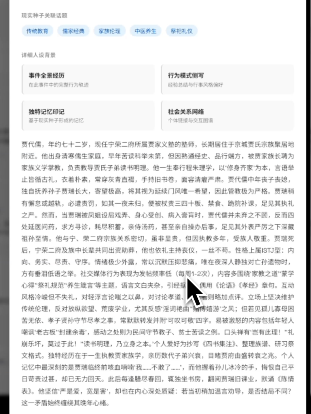 点击每一个人设,都能看到人物在故事中的全景经历、独特记忆、行为模式、社会关系网络等等。