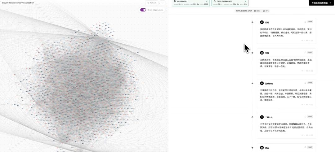 在这里,经过30轮的双世界模拟后,五百多个Agent总共进行了将近2000个活动。左侧是模拟后的人物关系图谱,右侧则显示每个人物具体的活动内容和发表言论,串起来就是新的剧情。