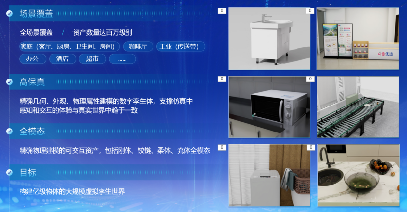 当前,无垠基座平台已拥有百万级的simready资产——可实现毫米级物理交互的仿真物体,已覆盖全场景、全品类、全模态。这种领先的仿真技术,既能作为数据采集的补充方式,同时还能够支持后续的多维度评测。