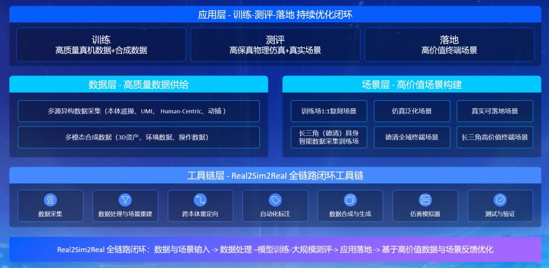 工具链层:以数据采集范式、跨本体数据迁移、自动化标注、生成式仿真、智能化评测等核心技术打造Real2Sim2Real全链路闭环工具链,打通从数据采集到测试验证的每一个环节