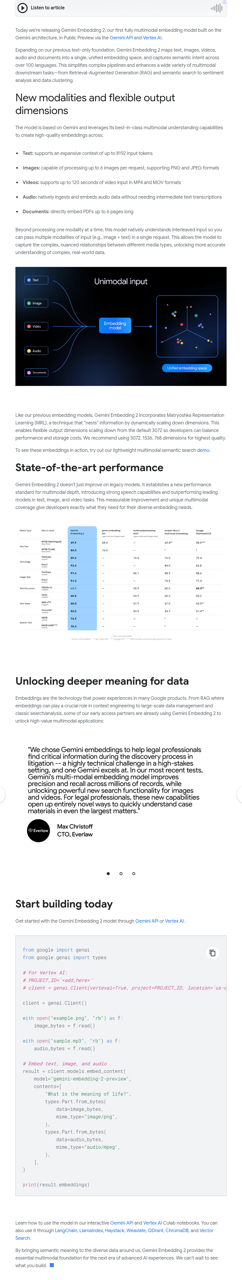谷歌今日发布Gemini Embedding 2(公测版),是其首个基于Gemini架构的全模态嵌入模型,支持文本、图像、视频、音频及文档统一映射至同一嵌入空间,并覆盖100多种语言的语义意图理解。该模型显著简化多模态处理流程,提升RAG、语义搜索、情感分析与数据聚类等下游任务效果。文本支持最长8192词元;图像单次请求最多处理6张PNG/JPEG格式图片;视频支持MP4/MOV格式、最长120秒;音频亦被原生支持。通过灵活输出维度与强大跨模态理解能力,为开发者提供更高效、通用的嵌入解决方案。