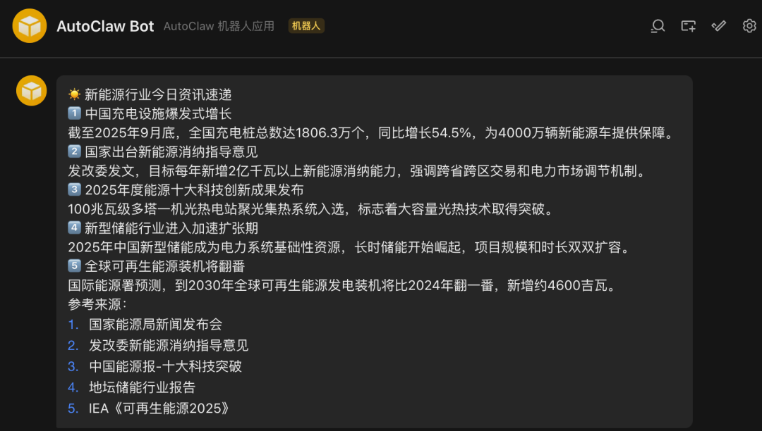 每天晚上9点10分,抓取新能源行业最新资讯,推送到我们的飞书聊天界面。