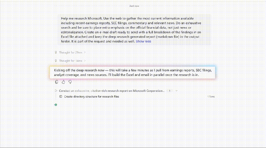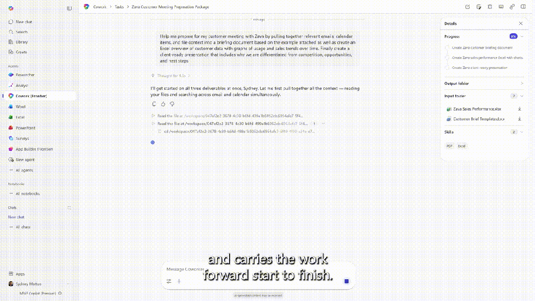 仅需描述想要的结果,Cowork就会自动基于邮件、会议、消息、文件和数据来推进工作。
