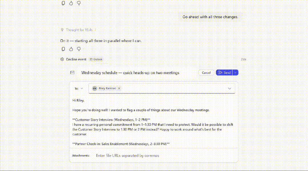 你批准之后,它直接动手——帮你接受、拒绝或重新安排会议,插入专注时间段,甚至还能提前发送会议准备文档。
