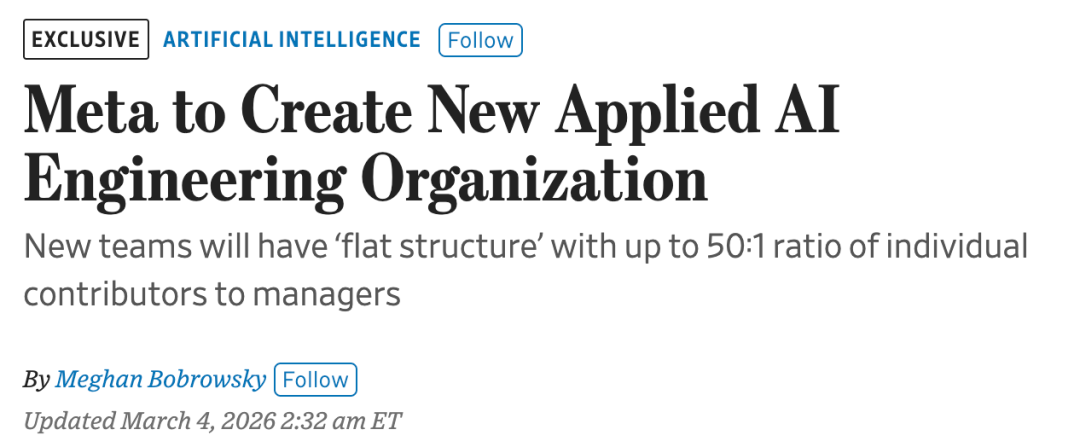 与此同时,Meta正在打造一种「极致扁平」的组织架构,即一线员工(IC)与经理的比例最高可达50:1 。