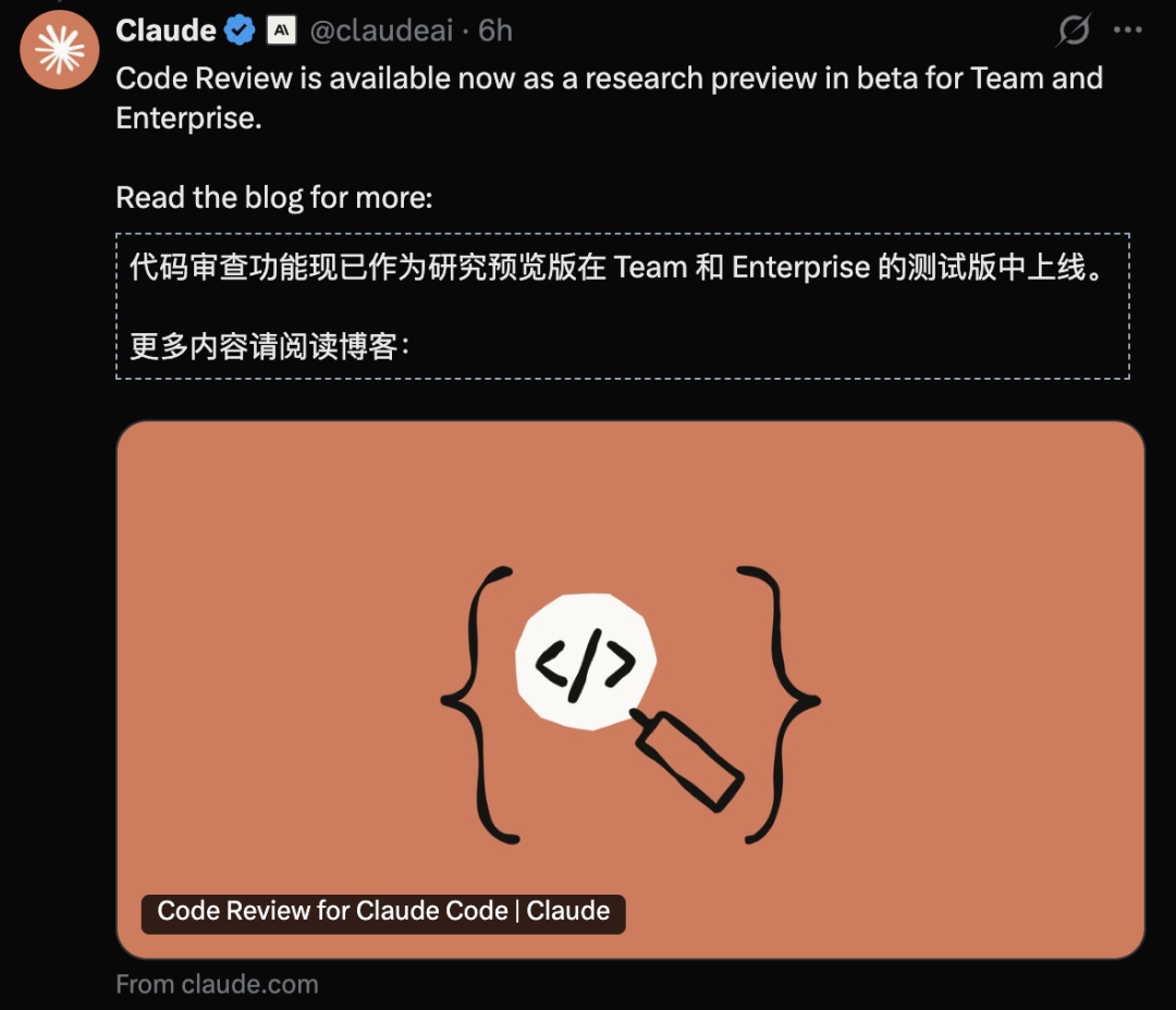 Claude Code之父重磅官宣:Claude Code新增代码评审(Code Review)新功能。