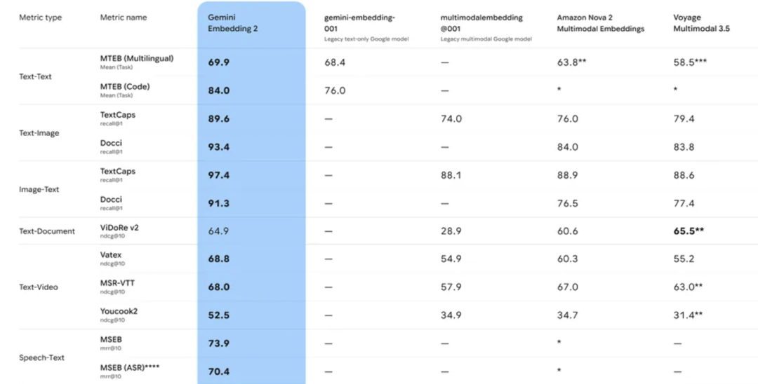 在评测方面,Gemini Embedding 2不仅整体性能较上一代提升,同时也为多模态嵌入任务树立了新的性能基准。