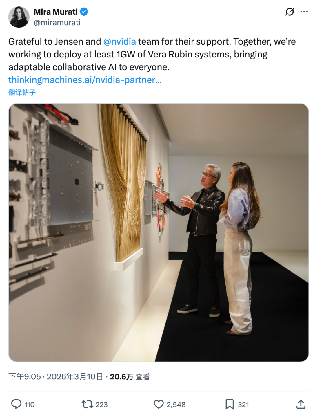 公司官宣的同时,CEO Mira也以个人名义发文对英伟达团队和黄仁勋表达了感谢。