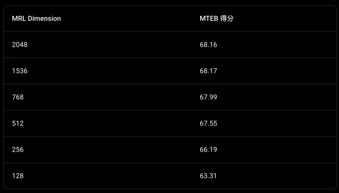即便你把预算压缩到极致,将向量体积暴减 75% 降至 768 维,其跑分也仅仅微跌了 0.18 分(67.99 分)。