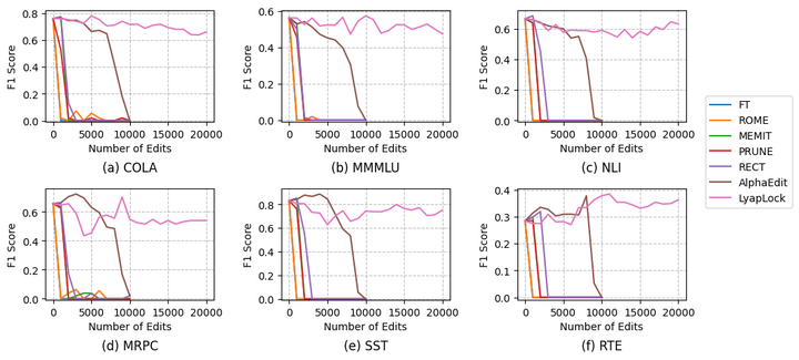 在连续编辑10,000次后,所有的基线方法(ROME, MEMIT, PRUNE, RECT, AlphaEdit)在 GLUE 六大下游任务上全军覆没,性能暴跌至0%。而LyapLock稳如泰山,甚至当把压力测试拉高到20,000次编辑时,模型依然保持着极佳的通用语言能力。同时,在其他基线方法的Preservation Loss类似指数上升的同时,LyapLock方法将其限制在了一定的阈值内(图3,图4)。