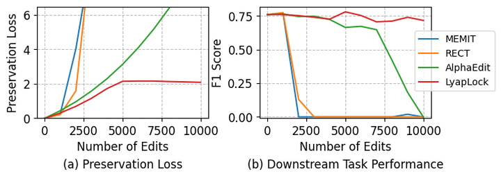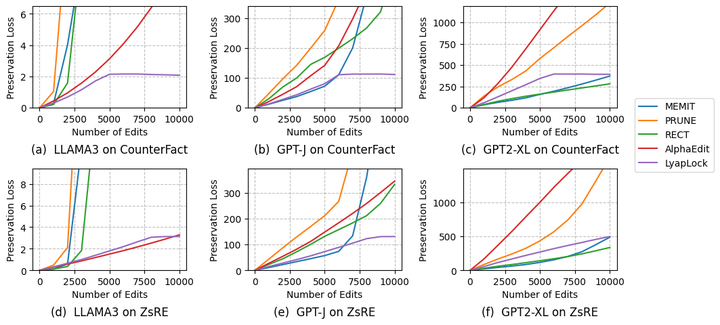 每次编辑似乎只破坏了一点点原有知识,但一万次编辑之后,累积的保留损失(Preservation Loss)会呈现单调上涨的失控态势 。