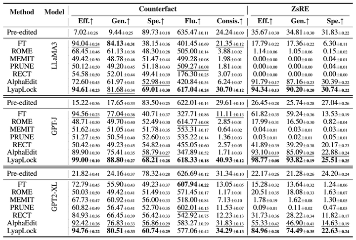 不仅老知识护得好,新知识也学得精。相比于第二强的基线AlphaEdit,LyapLock的平均编辑效力(Efficacy)硬生生拔高了11.89%。在LLaMA3-Counterfact场景下,泛化能力更是拉开了19.71%的巨大差距 。