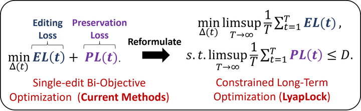 为了解决这个问题,中科院信工所的研究人员提出了LyapLock,将连续编辑建模为一个受约束的随机规划问题。鉴于累积保留误差约束以及逐渐揭示的编辑任务所带来的挑战。