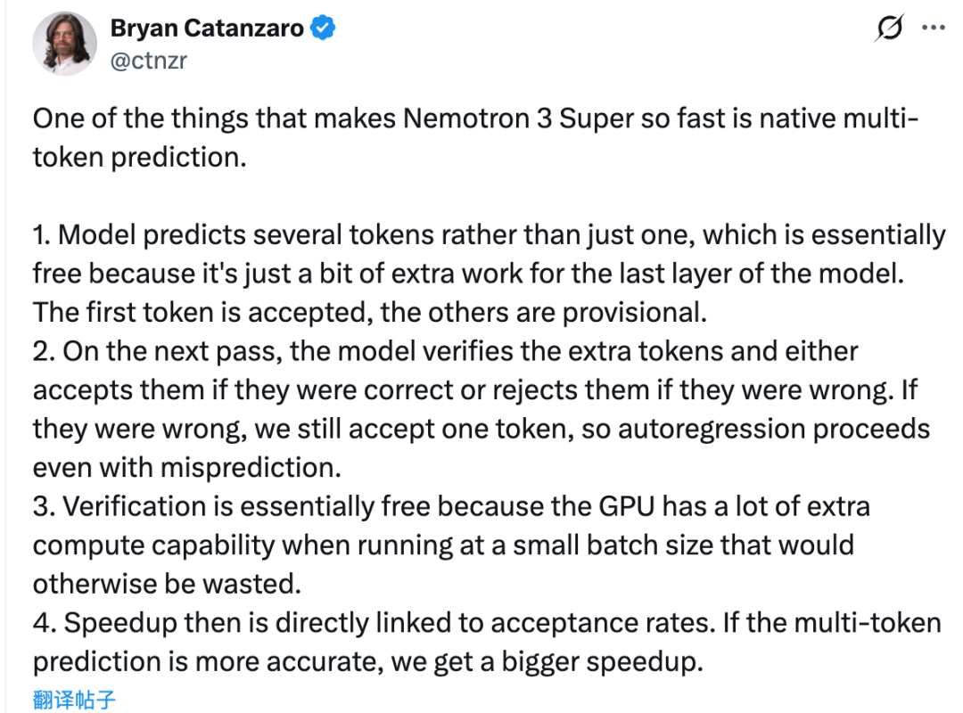 与逐个预测token的传统模式不同,Nemotron 3 Super通过共享权重设计,在单次前向传递中即可并行预测未来的多个token。