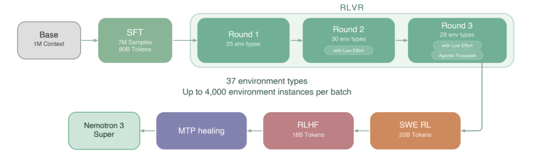为了让Nemotron 3 Super真正具备执行任务的智能体能力,英伟达在后训练阶段通过多层级的加固策略对其进行了全方位打磨。