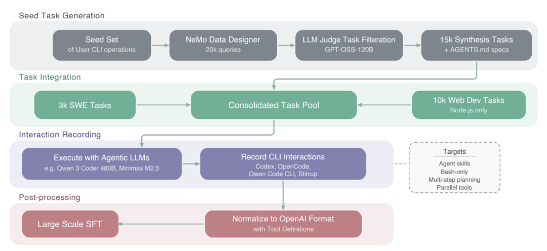 针对实际应用中的智能体命令行交互,英伟达构建了一个包含2万个初始查询的种子任务集,并利用模型作为裁判进行了精细过滤,最终沉淀出1.5万个核心合成任务。