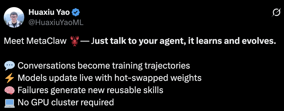 MetaClaw这项工作由姚骅修领导,他是电子科技大学校友,现任UNC计算机科学系的助理教授,曾在Stanford AI Lab做博士后,专注于Agent和具身AI。
