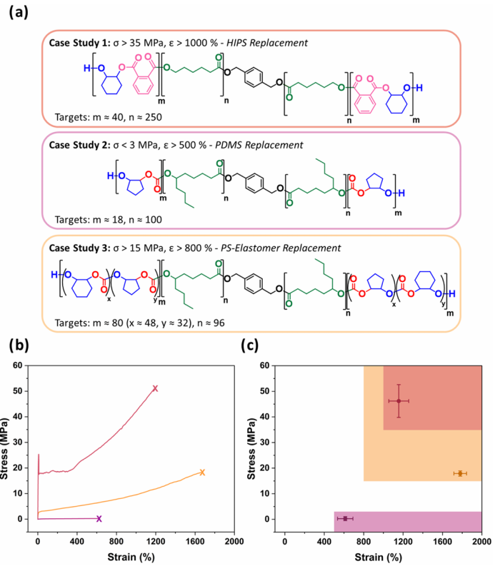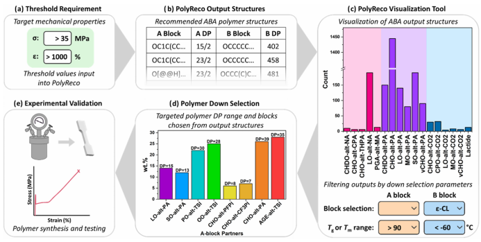 为了评估 PolyReco 在实际应用中的可行性,作者选取了三个不同材料性能的案例研究。对于每一组预设的 应力σ 和应变 ε 阈值,PolyReco 会生成对应的 ABA 嵌段聚合物结构及其各嵌段的DP。随后,这些输出结果通过可视化工具进行进一步筛选,对结构、合成可行性、玻璃化转变温度等关键参数进行过滤,帮助确定材料的加工温度窗口和使用温度范围,随后再进行实验验证。(图4)