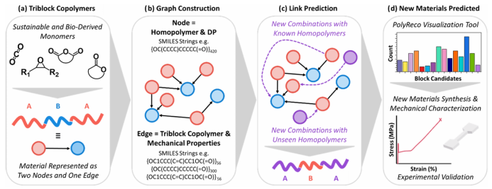 本文提出了一种基于图的链接预测的聚合物推荐系统 PolyReco,用于发现满足特定机械性能阈值的含氧 ABA 嵌段聚合物。研究利用由 ROP 和 ROCOP 合成的聚酯和聚碳酸酯数据构建的数据库训练模型,将材料设计问题转化为阈值条件下的链接预测问题,通过学习不同嵌段化学结构及其聚合度之间的关系,预测新的嵌段组合是否能够满足目标应力和应变性能要求,并推荐潜在可合成的材料候选。