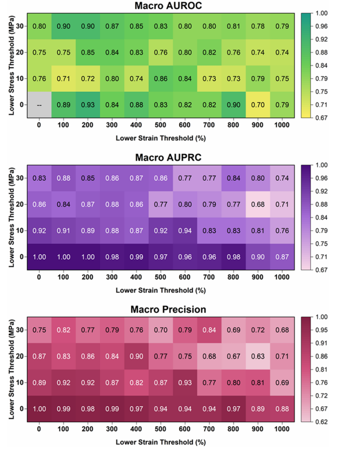 图5. 新材料的实验力学性能及与预测阈值的比较。