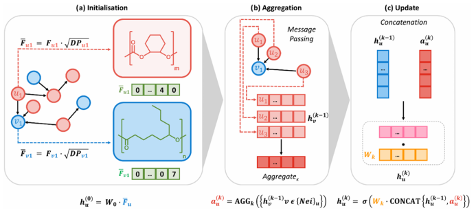 PolyReco 的链接预测过程包含 三个主要阶段:初始化、信息集成、特征更新与链接预测。首先,在初始化阶段,模型根据每个嵌段的 SMILES 结构提取分子特征,并结合聚合度(DP) 对特征进行非线性加权,然后将这些特征映射到模型可以处理的潜在空间中。其次,在信息集成阶段,模型通过图神经网络的消息传递机制,让每个嵌段从相邻嵌段及自身节点获取信息,并利用图注意力机制对这些信息进行加权整合,从而学习不同嵌段组合之间可能产生的结构相互作用。最后,在特征更新与链接预测阶段,模型根据整合后的信息更新每个嵌段的表示,并将两个嵌段的特征进行组合,预测它们是否能够形成满足目标机械性能要求的嵌段聚合物结构。(图2)