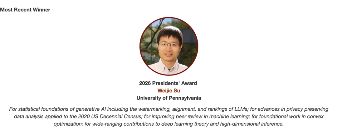 宾夕法尼亚大学苏炜杰教授,凭借在AI可信部署、隐私保护、凸优化理论及AI会议学术评审机制上的突破性贡献,荣获考普斯会长奖(COPSS Presidents’ Award)。