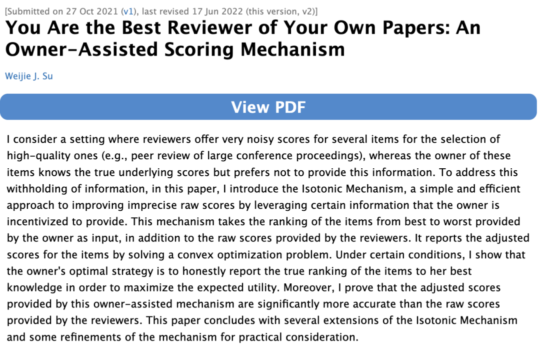 这个做法,其实和我五年前的一篇论文有关。核心观点大致是:既然作者往往是自己论文最好的审稿人,何不引入一种由作者本人参与的评分机制?