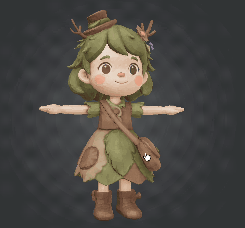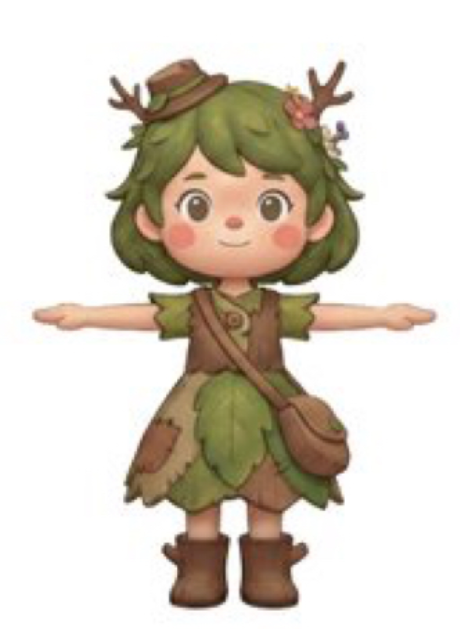 一位森林精灵角色,身穿树叶服饰,脚踩靴子,背着小挎包。